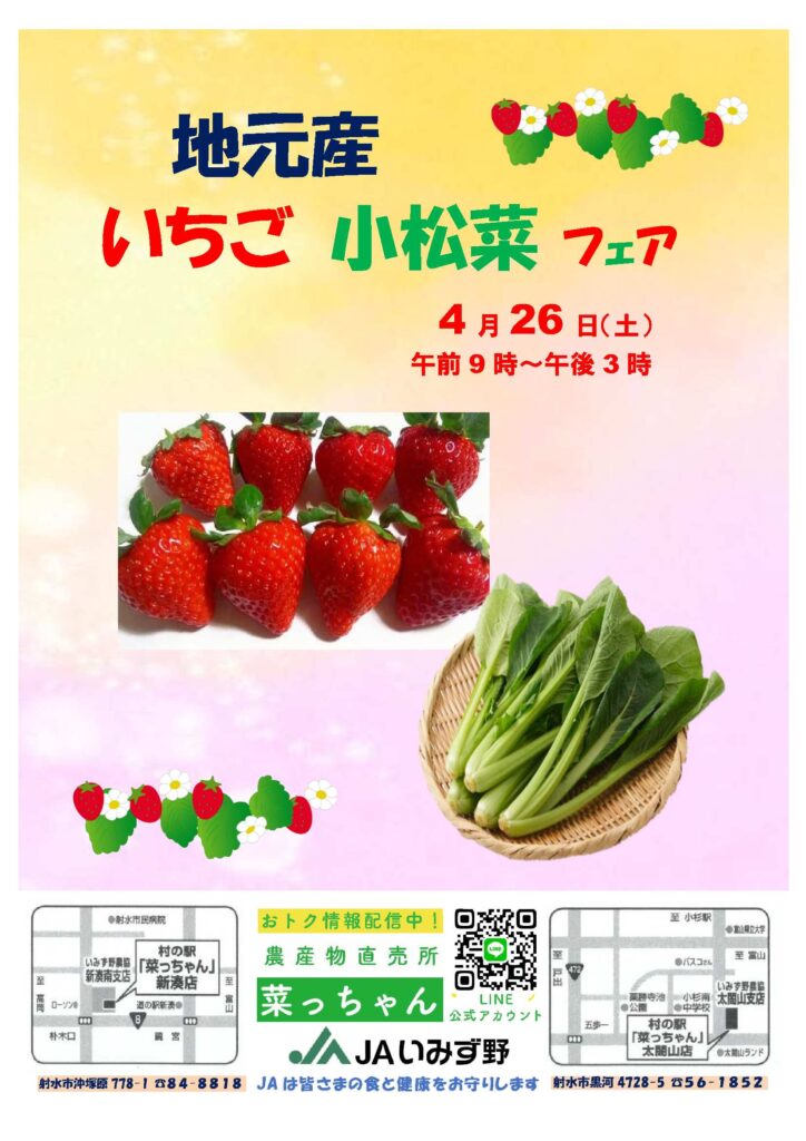 村の駅 菜っちゃんで「地元産いちご・小松菜フェア」を4月26日(土)に開催