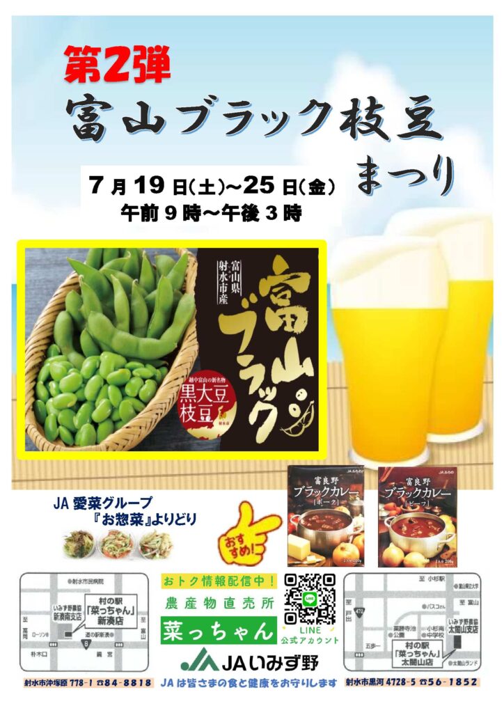 村の駅 菜っちゃんで「第2弾 富山ブラック枝豆まつり」を7月19日(土)~25日(金)に開催