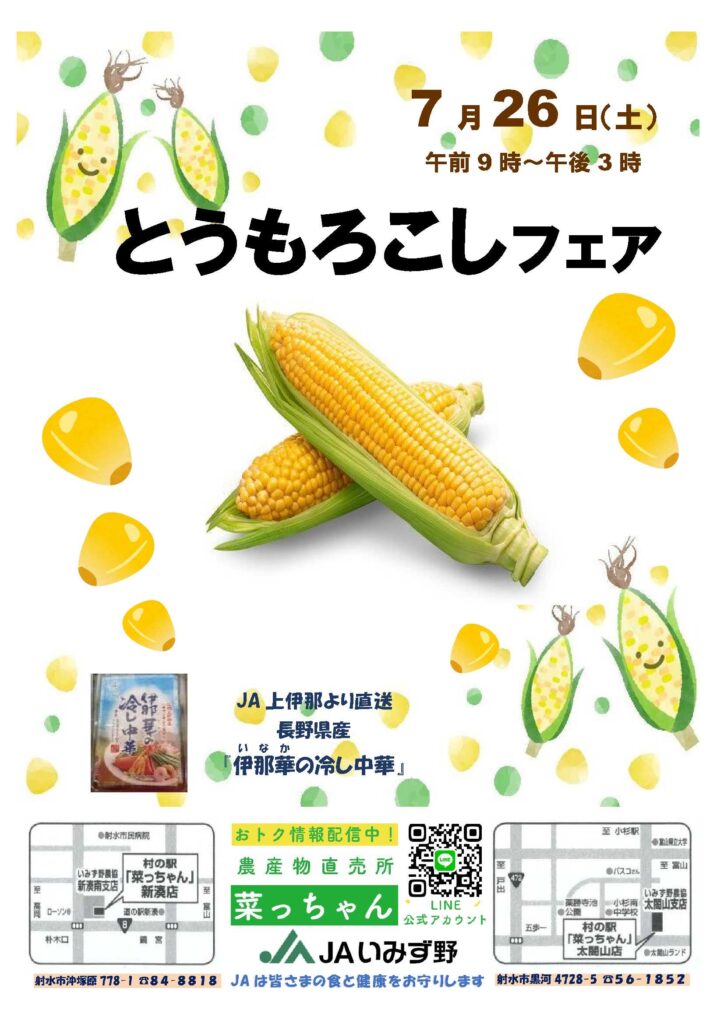 村の駅 菜っちゃんで「とうもろこしフェア」を7月26日(土)に開催