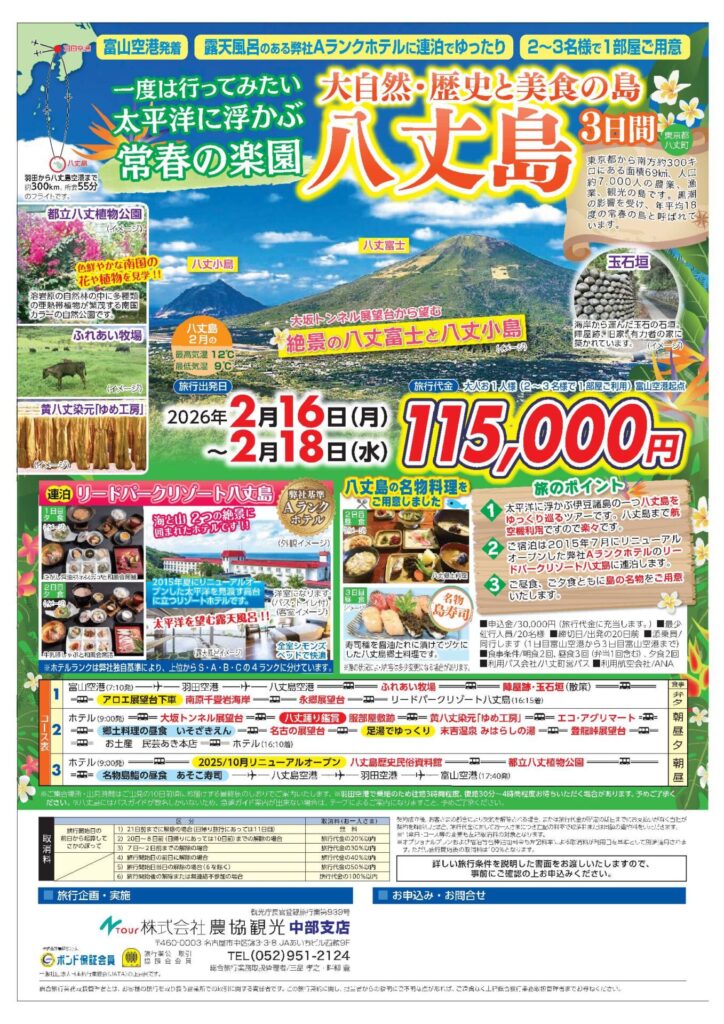 「大自然・歴史と美食の島 八丈島3日間♪」申込は令和8年1月28日(水)まで ※20名様以上のプランです