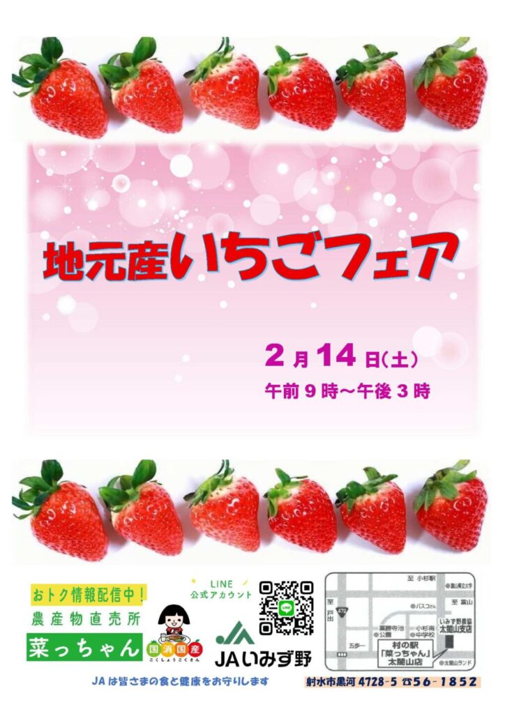 村の駅 菜っちゃんで「地元産いちごフェア🍓」を2月14日(土)に開催