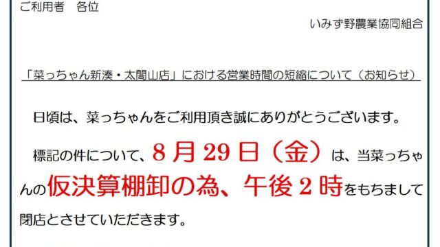 8月29日(金)村の駅 菜っちゃん営業時間短縮のご案内